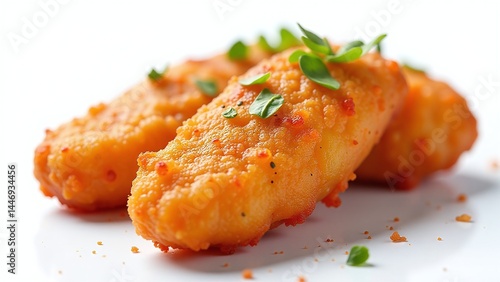 Spicy fish pakora, isolated on white background, chili-infused batter and crispy coating, high-resolution photorealistic shot