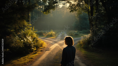 朝日に照らされる森の分かれ道と佇む女性、選択や人生の岐路のイメージ