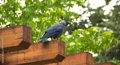 Ptak kawka na belce drewnianej w tle liście i gałęzie zielone