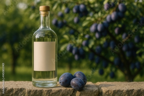 Plum brandy in a bottle with blank label and fresh plums in an orchard