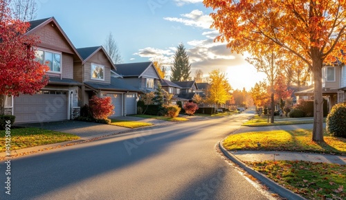 Autumnal Suburban Street at Sunset: Houses, Trees, and Warm Golden Light