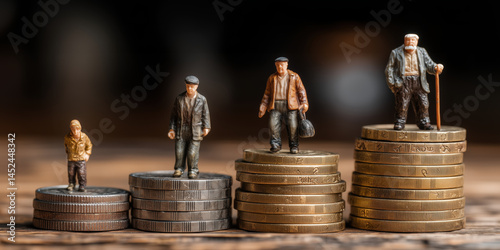 Miniature figure coin stack old man young man financial growth concept saving retirement