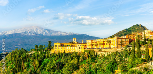 Amazing landscape of a beautiful mountain town Taormina in Sicily, Italy. Scenic view from a green mountain to a beautiful famous hotel and high majestic mount vulcan Enta in snow.