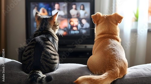 Cat and Dog Watching TV: A cat and dog sitting on a sofa, intently watching a television show together.