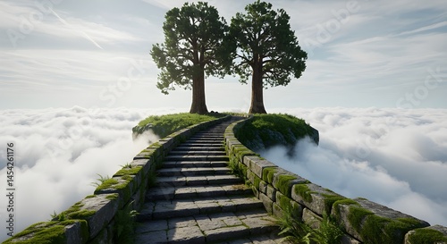 Stone Stairway Leading to Two Trees on a Cloud Island