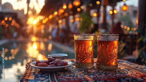 Two glasses of tea with dates on a table at sunset, a tranquil outdoor setting.