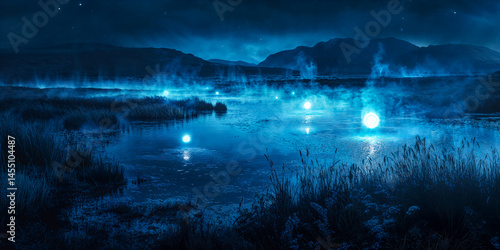 Glowing will-o-the-wisps over a bog in Ireland, night, wide banner