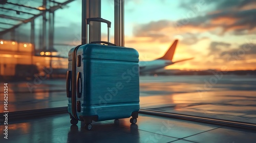 A stylish teal suitcase sits in an airport at sunset, ready for a new journey.