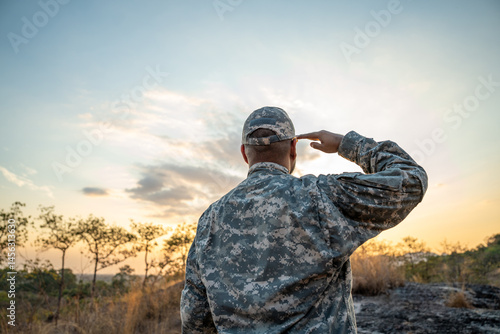Us Army veteran honors Veterans Day. Man soldier adjusts the US military patch before duty. A US soldier with an American flag patch on his uniform prayers for Memorial Day. Independence Day