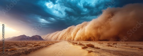 Panorama sand storm with majestic wave of dust and wind concept. A dramatic sandstorm rolling across an open landscape at sunset.