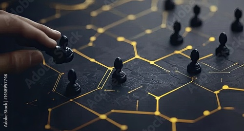 A hand strategically places a small black figure on a honeycomb-patterned board, connected by golden lines. Miniature figures are positioned around it, signifying a network or system