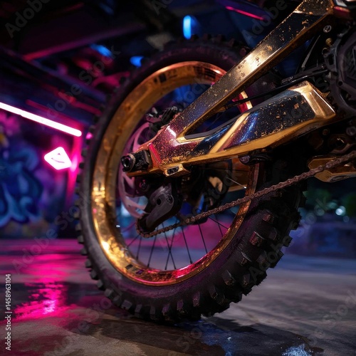 Close-up of a gold and black mountain bike's rear wheel and frame with speckled gold finish in pink and blue lighting