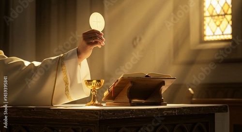 Priest holding eucharist wafer during mass with chalice and open bible on altar with light rays