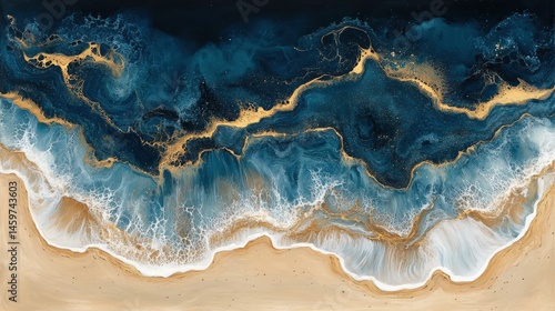 Gilded ocean waves crashing onto sandy shore
