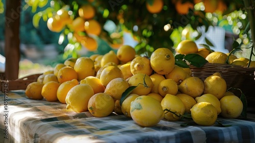 Fresh heap italian ripe yellow sicilian lemons on the wooden table.