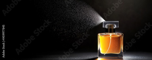 Elegant Perfume Bottle Spritzing on Black Background, Fragrance ,Luxury