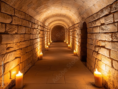 Candlelit stone passageway with an arched ceiling, creating a warm, historic, and mysterious atmosphere.