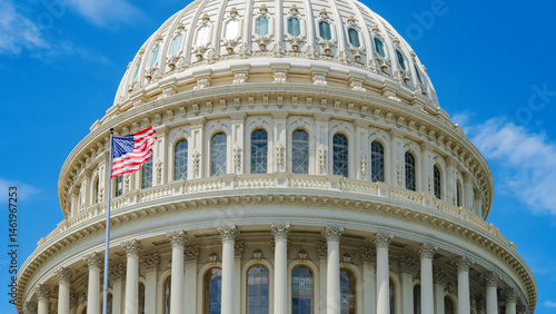 close-up of the Capitol Dome in Washington, D.C. and the American flag in the wind.