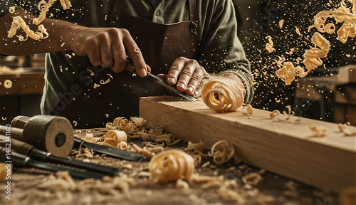 工房で木材をノミで削る木工職人の手元