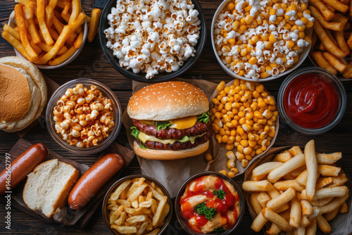 Delicious assortment: burgers, fries, and shakes. Rich colors, tempting presentation. Perfect for a hearty meal or casual get-together.