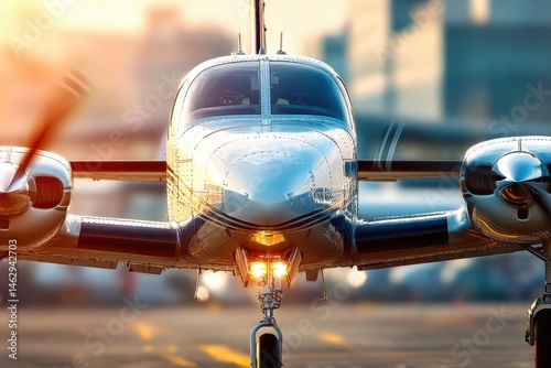 Front view of a small airplane with spinning propellers on the runway at sunset, reflecting the golden light, ready for take-off on a beautiful sunny day.