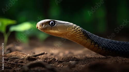King Cobra slinking across jungle clearing, captured in natural movement with long focal length and detailed focus