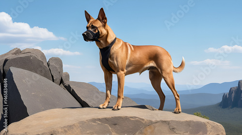 Muscular, fawn-colored dog with black mask alertly perches on a rock, its piercing gaze focused on the distance. Moonbark. Illustration