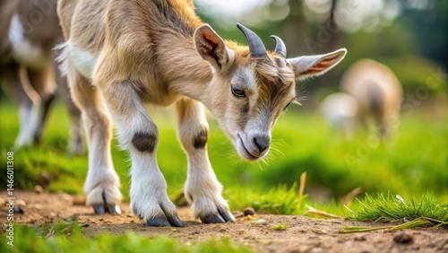 Little goat in pasture scratching leg with hoof close-up, rural scene, farm animals