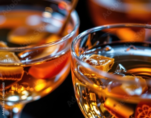 a macro photograph emphasizing the textures of the garnish, liquid glow, and reflections on the glasses at close up.