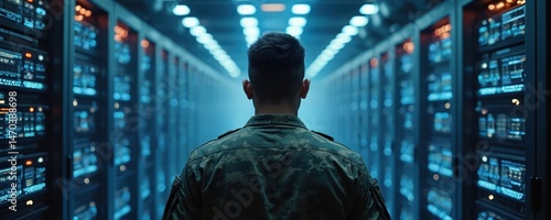 Soldier in uniform stands in server room with high-tech tech equipment. Military person in camo serves as cyber defense force protector. Modern digital IT, network security and data protection.