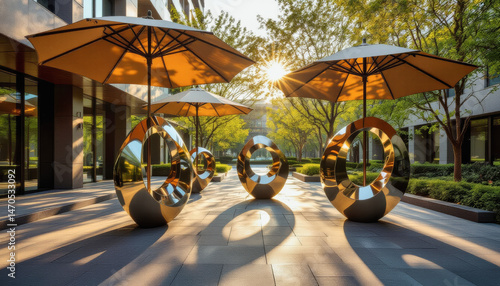 Sunlight filters through trees and illuminates a modern outdoor courtyard featuring reflective sculptures, umbrellas, and a sleek building facade.