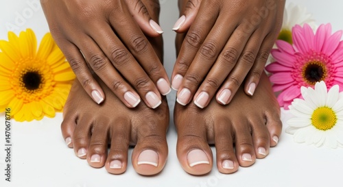 Mãos e pés de mulher negra brasileira com manicure e pedicure impecáveis ao lado de flores – estética e beleza para salões