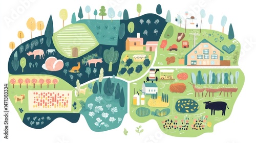 A concept map linking farming, food processing, and consumption in a farm-to-fork cycle.