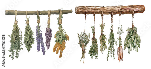Watercolor Hanging Bundles of Dried Herbs and Vegetables
