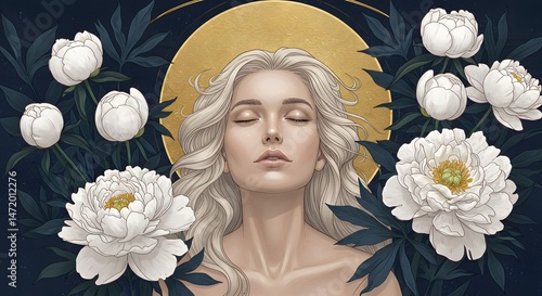 Elegant portrait of a fair-haired woman surrounded by white peonies, exuding tranquility and serenity with a mystic golden halo and a dark moody background