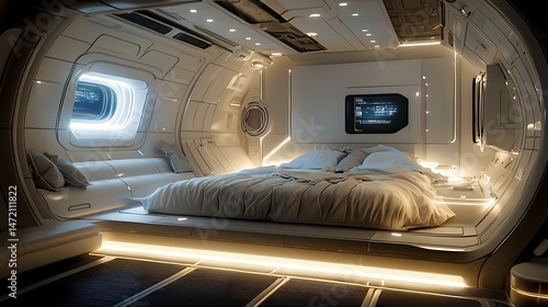 A zero-gravity sleeping chamber with softly pulsing ceiling lights, fully insulated soundproof walls and floating bed system, 8K sharp render