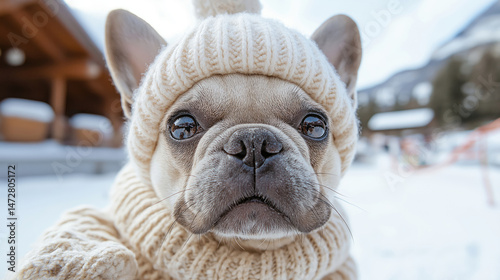 Adorable fawn-colored dog in a cream-colored knitted winter hat and sweater, posing outdoors in snowy landscape