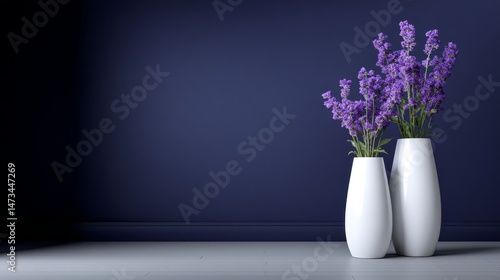 Two sleek white vases filled with blooming lavender sprigs are displayed against a navy background, showcasing their elegance with soft and inviting lighting