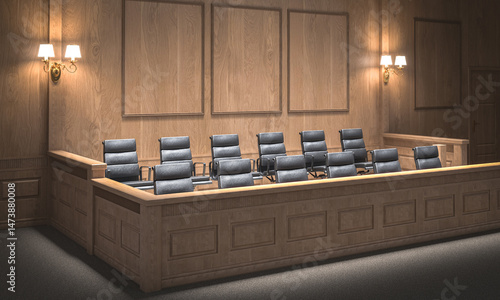 Courtroom with empty jury box illuminated by wall lamps 3d