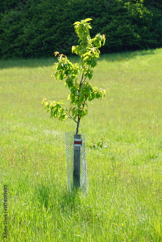 Siatka chroniąca drzewo przed szkodnikami. Młode drzewko zasadzone na łące.