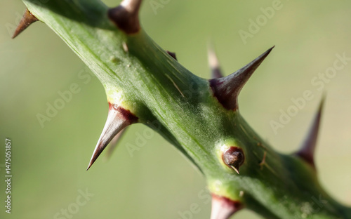 Extreme Close Up of Sharp Thorns on Green Plant Stem in Nature