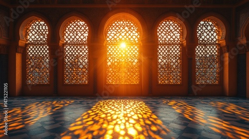 Sunlight streams through ornate arches, illuminating a grand hall. Intricate latticework windows cast golden patterns on the floor