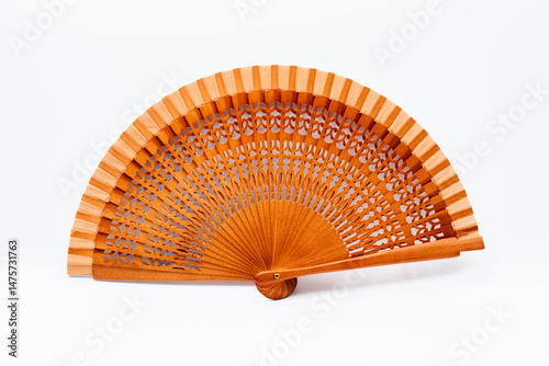 Abanico tradicional español de madera abierto, pintado con diferentes motivos y colores