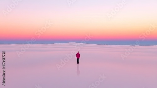 Solo figure amidst clouds. Pink horizon. Minimalist scenic photo of serene isolation