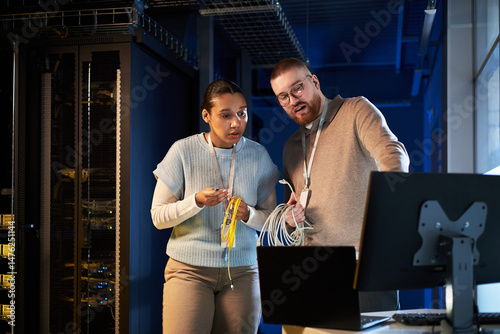 Caucasian female and Caucasian male engineers setting up network infrastructure in modern server room examining cables and hardware with serious expressions