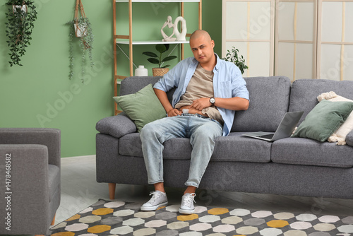 Young man with medical patch after appendix surgery sitting on sofa at home