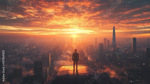 A confident business leader standing on a futuristic skyscraper rooftop, overlooking a thriving metropolis