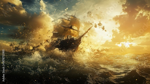 Majestic sailing ship navigating rough seas during a golden hour sunset