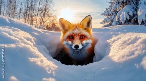 Curious red fox emerging from snow burrow at sunset