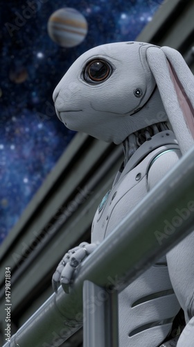 White robotic rabbit gazing at the cosmos from an elevated platform